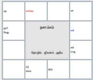 தசாம்சத்தில் கடக லக்னாதிபதி சந்திரன் 5, 1௦ அதிபதியும் லக்ன யோகாதிபதியுமான செவ்வாயுடன் விருட்சிகத்தில் நீச பங்கப்பட்டுள்ளார். இதனால் ஜாதகி சந்திரன், செவ்வாய் ஆகியவற்றின் காரக தொழிலை செய்தால் சிறப்படைவார் எனலாம். 2 ல் சுக்கிரன், ராகு சேர்க்கையை சூரியன் பார்ப்பதால் ஜாதகி நவீன மின்னணுப் பொறியியல் , மென்பொருள்கள் ஆகியவற்றுடன் தொடர்பாகவும் வாய்ப்பு வரும். 1௦ ஆமிடமான மேஷத்தில் அமைந்த சனி வக்கிரம் பெற்றதால் நீச பங்கப்படுவதோடு, குரு பார்வையையும் பெற்று சிறப்படைந்துள்ளார். வக்கிர சனி ஜாதகி எந்தத் தொழில் செய்தாலும் அதில் பிடிவாதமான தொழில் அறிவை தருவார். சுக ஸ்தானமான 4 குரு நின்று 1௦ ஆமிட சனியை பார்ப்பதால் ஜாதகி எந்தத் தொழில் செய்தாலும் அதிகமாக சிரமப்படாமல் பார்த்துக்கொள்வார். தசாம்ச லக்னமே கால புருஷ 4 ஆமிடமாக அமைந்து, லக்னாதிபதி சந்திரன் பூமி காரகர் செவ்வாய் தொடர்பு பெறுவதால் ஜாதகி நிலம், வீடு விற்பனையில் ஈடுபடுவார். வாகன காரகர் செவ்வாய் சந்திரனுடன் இணைவதால் தனது காரமான வாகனத்தை இழந்து சந்திரனின் காரகமான உணவு என்பதை பெற்றுக்கொள்கிறார். இதனால் இங்கு வாகனம் எனும் காரகம் அடிபடுகிறது. உணவு எனும் காரகம் மேலோங்குகிறது. 2 ஆமிட கிரகங்கள் குடும்பத்திற்கு கணினி, மென்பொருள் தொடர்பான வருமானம் வருவதை குறிப்பிடுகின்றன. ஆனால் ஜாதக அமைப்பு சுட்டிக்காட்டும் தொழில்கள் அனைத்திலும் ஒரு ஜாதகர் ஈடுபட வாய்ப்புண்டா? என்பதை தசா-புக்தி கிரகங்களே முடிவு செய்யும் என்று பார்த்தோம்.