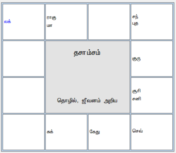 தொழிலுக்காக ஆராய வேண்டிய தசாம்சத்தில், உணவு காரகர் சந்திரன் புதனுடன் இணைந்து 10-ஆம் இடத்தைப் பார்ப்பதே ஜாதகர் உணவுத் தொழில் செய்யக் காரணமாகிறது. இருவரும் உச்சம் பெற்ற லக்னாதிபதி குருவின் புனர்பூச நட்சத்திரத்தில் நிற்பதால், இத்தொழில் ஜாதகருக்குச் சிறப்பைத் தருகிறது.