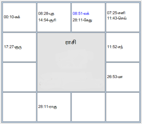 லக்னாதிபதி சுக்கிரன் 11-ஆம் இடமான மீனத்தில் உச்சம் பெற்றுள்ளதைக் கவனிக்கவும். மீனம் கால புருஷனுக்கு இரவைக் குறிப்பிடும் ராசியாகும். 2-ஆம் இடம் மிதுனத்தில் அமைந்த ஜீவன காரகர் சனி, தனது 10-ஆம் பார்வையால் மீனச் சுக்கிரனைப் பார்க்கிறார். பகலை ஆளும் சூரியன் லக்னத்திற்கு இரவைக் குறிப்பிடும் 12-ஆம் இடமான மேஷத்தில் அமைந்துள்ளார்.